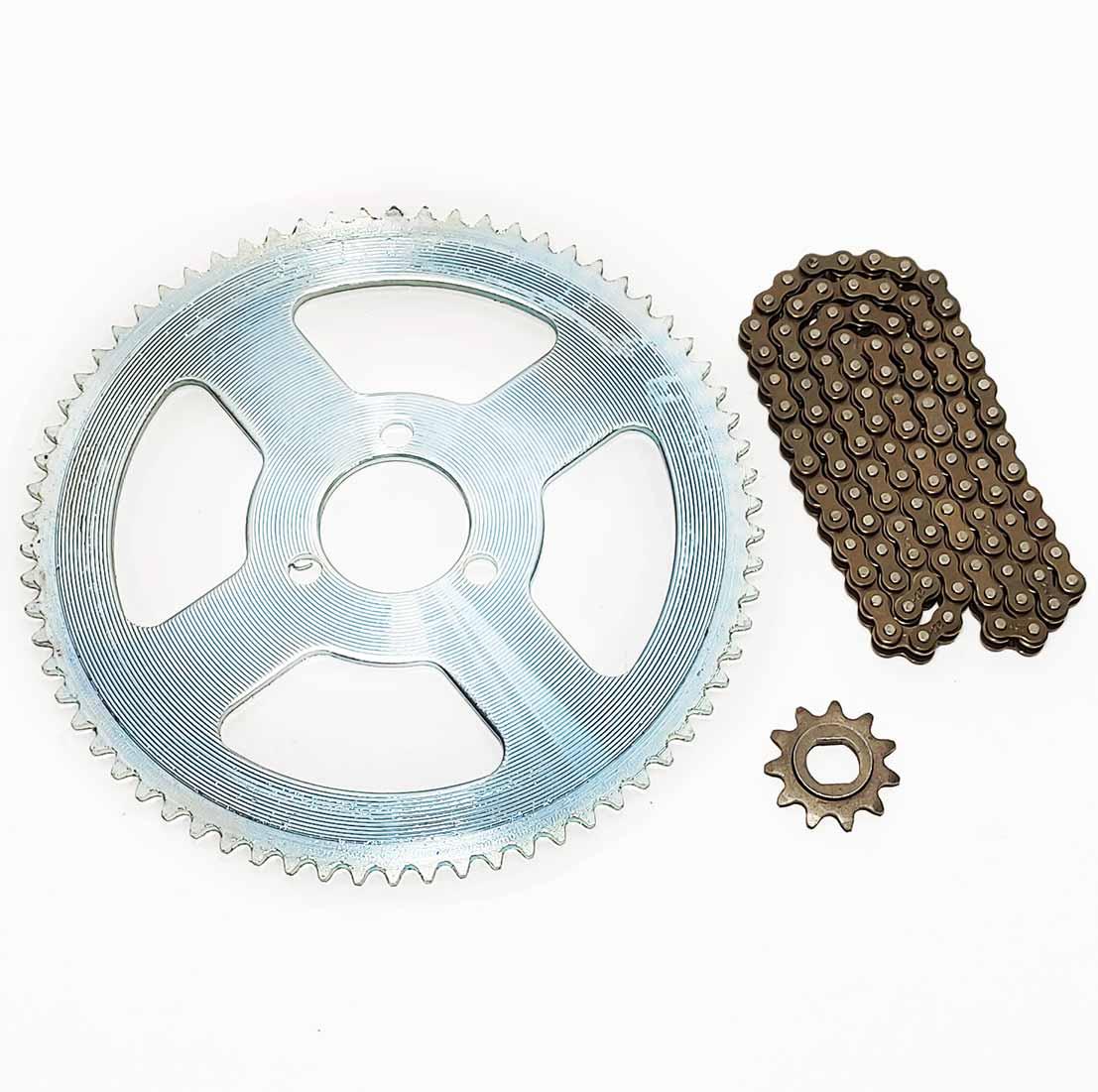Приводний комплект для дитячих квадроциклів з електричними двигунами. Комплект складається з двох зірок — відомою на 72 зуби та провідною на 11. Ланцюг підбираємо під вашу відстань, позаяк у різних моделях він різний, для цього потрібно заміряти відстань від середньої точки вала двигуна до приблизної середини осі. За мінімального ланцюга відстань співвідношення виходить 125 мм.